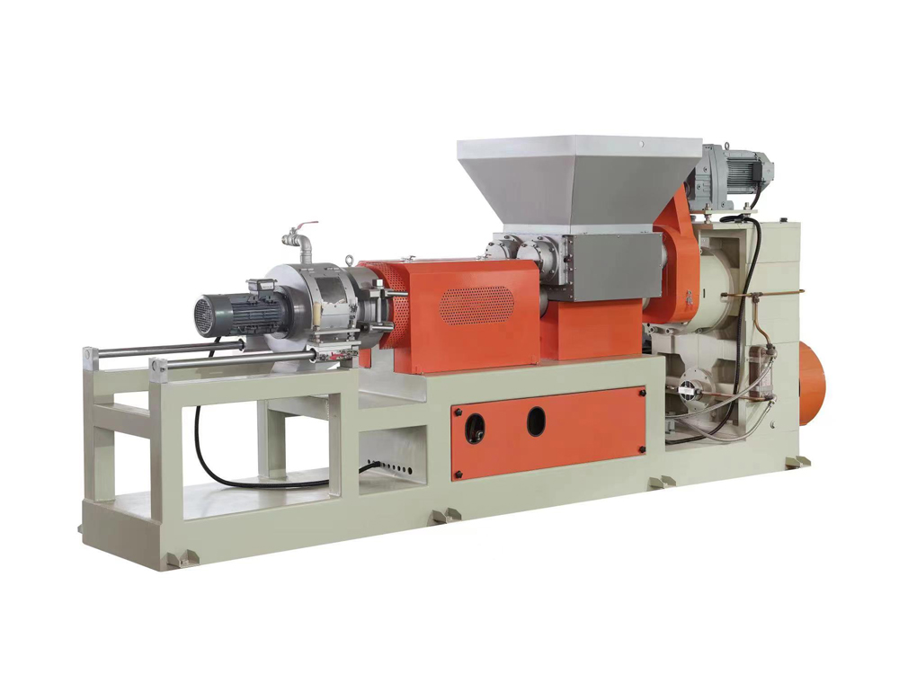 此機臺用于PVC,EVA,TPR等塑膠原料的生產,包括主機,雙腕入料,模頭切粒等系統(tǒng)將密煉機攪拌好的原料經雙腕擠入造粒機內經螺桿擠出后切成粒子,此機臺操作簡單